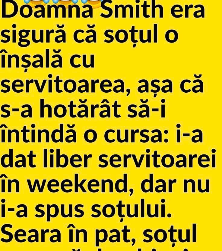 Doamna Smith era sigură că soțul o înșală cu servitoarea, așa că s-a hotărât să-i întindă o cursa: i-a dat liber servitoarei în weekend, dar nu i-a spus soțului.Seara în pat, soțul avea că de obicei aceeași scuză: