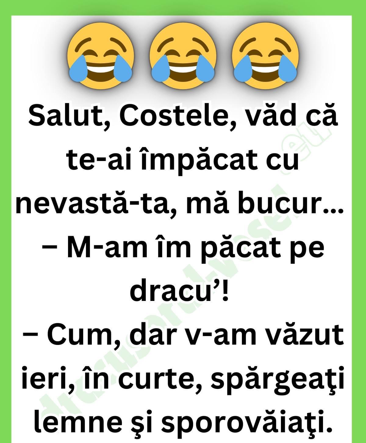 Ion se căsătoreşte cu Maria după doar trei luni de relaţie. După o săptămână de la nuntă Maria naşte… Iese Ion în sat să facă o cinste la prieteni, la care ăştia încep:– Bă Ioane, ce eşti mă aşa prost?! Nu e mă copilul tău, că voi nu aveţi decât trei luni împreună. mă!Ion, dezamăgit … Read more