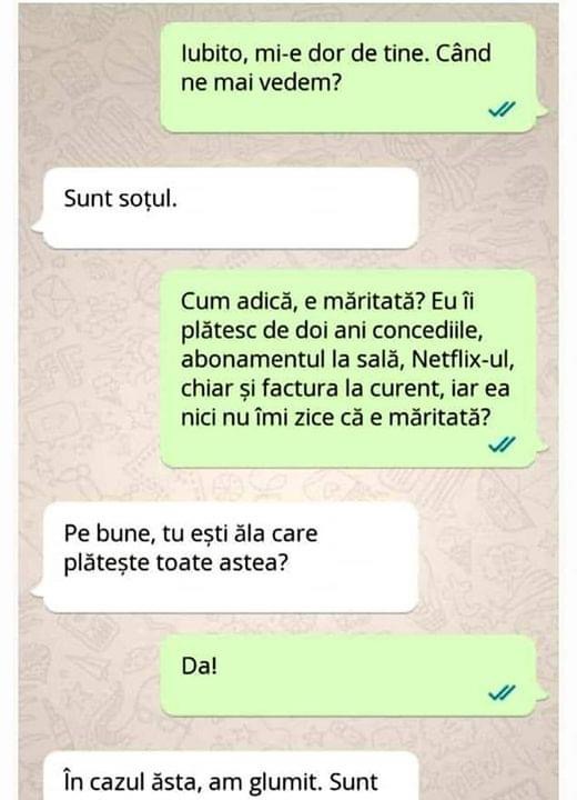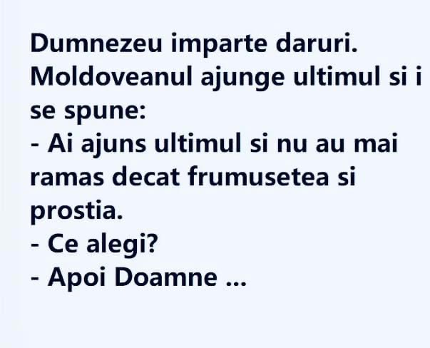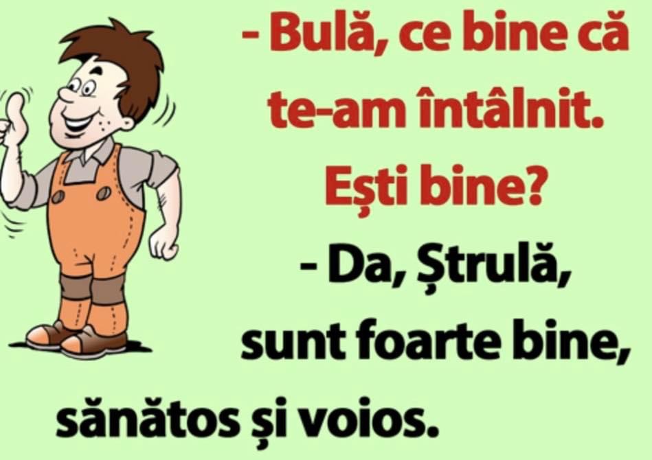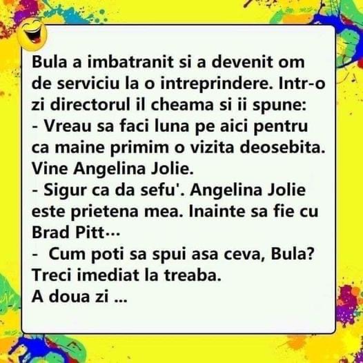 Bula a imbatranit si a devenit om de serviciu la o intreprindere. Intr-o zi directorul il cheama si ii spune: – Vreau sa faci luna pe aici pentru ca maine primim o vizita deosebita. Vine Angelina Jolie. – Sigur ca da sefu’. Angelina Jolie este prietena mea. Inainte sa fie cu Brad Pitt… – Cum … Read more
