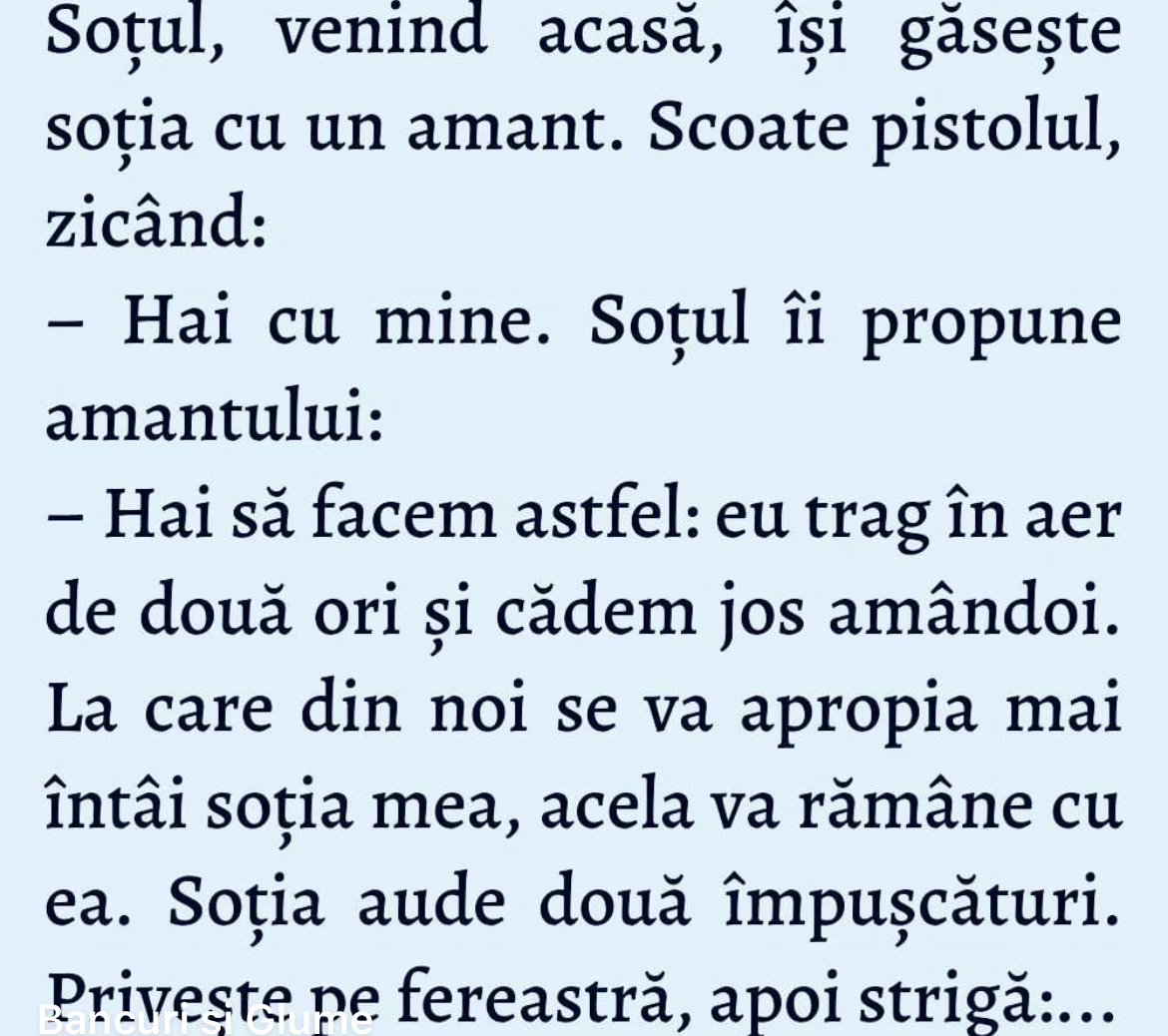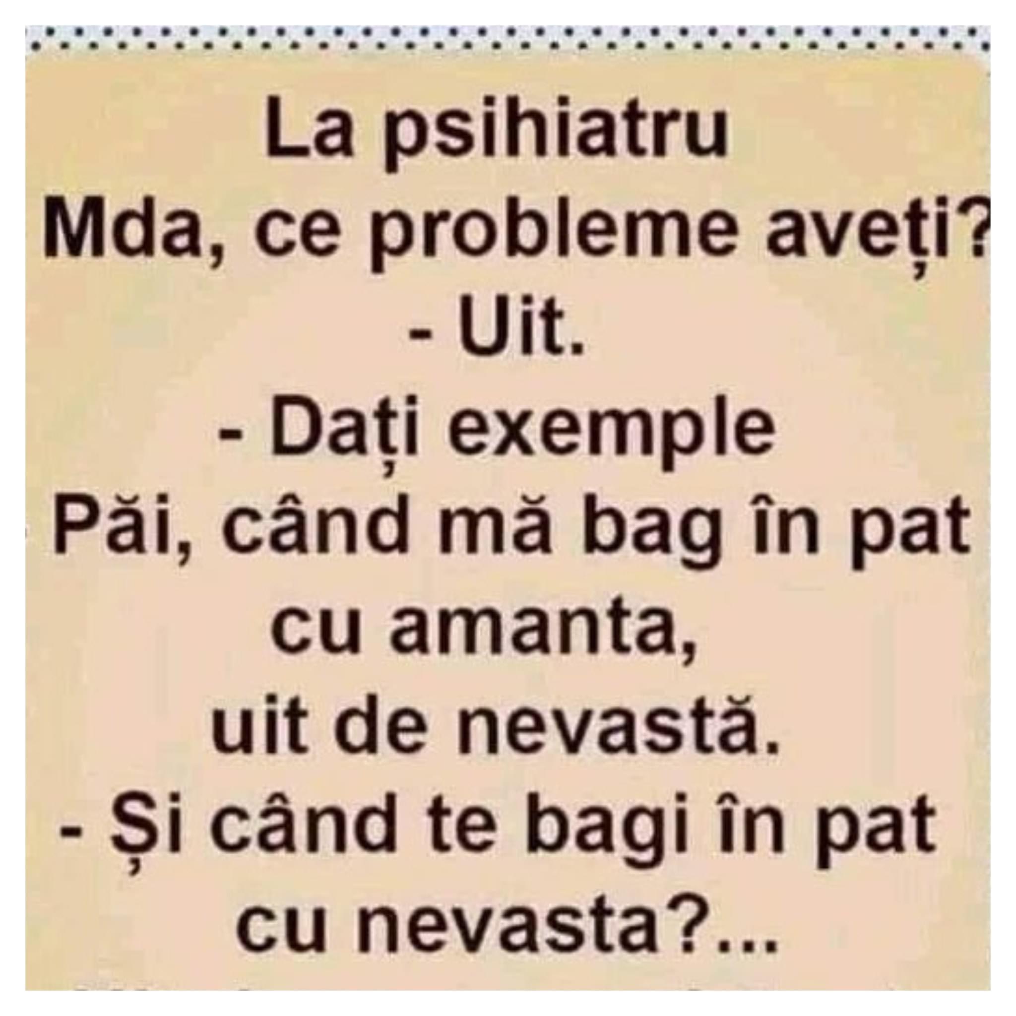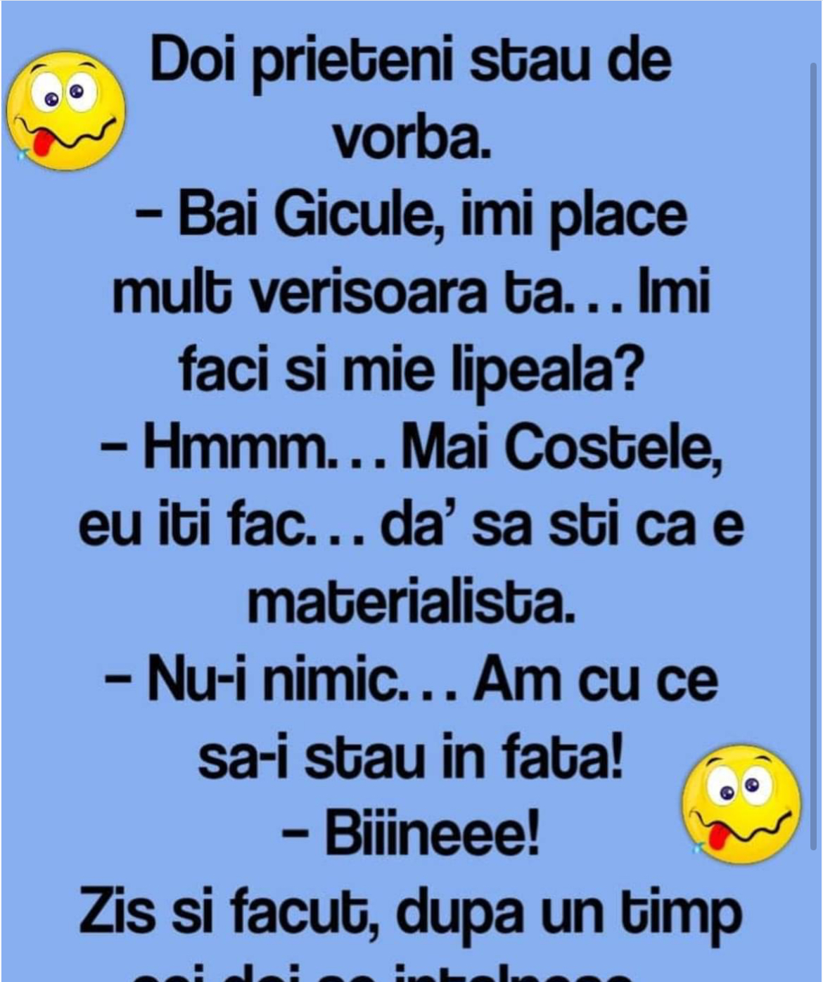 Doi prieteni stau de vorba.– Bai Gicule, imi place mult verisoara ta… Imi faci si mie lipeala?– Hmmm… Mai Costele, eu iti fac… da’ sa sti ca e materialista.– Nu-i nimic… Am cu ce sa-i stau in fata! – Biiineee!Zis si facut, dupa un timp cei doi se intalnesc…– Ia zi, ai un serviciu bun?– … Read more