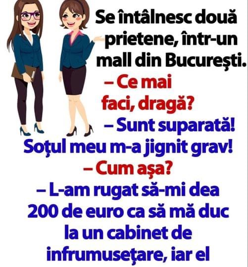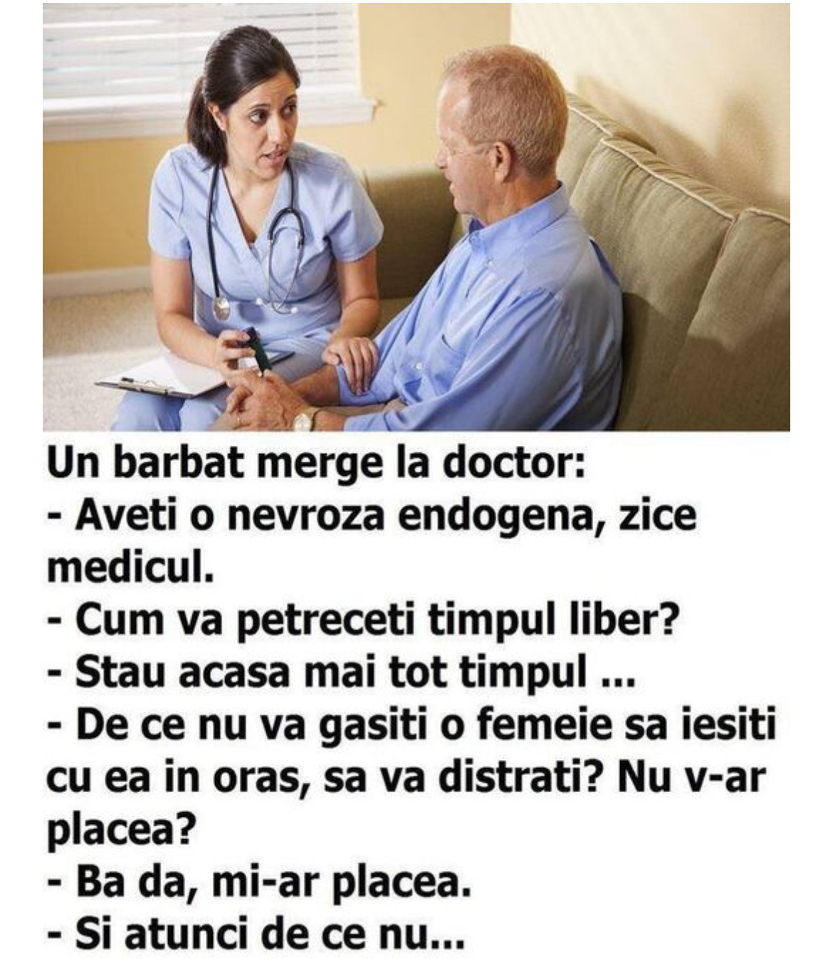 Un barbat merge la doctor:– Aveti o nevroza endogena, zice medicul.– Cum va petreceti timpul liber? – Stau acasa mai tot timpul …– De ce nu va gasiti o femeie sa iesiti cu ea in oras, sa va distrati? Nu v-ar placea?– Ba da, mi-ar placea. Si atunci de ce nu o faceti? Sunteti timid?– … Read more