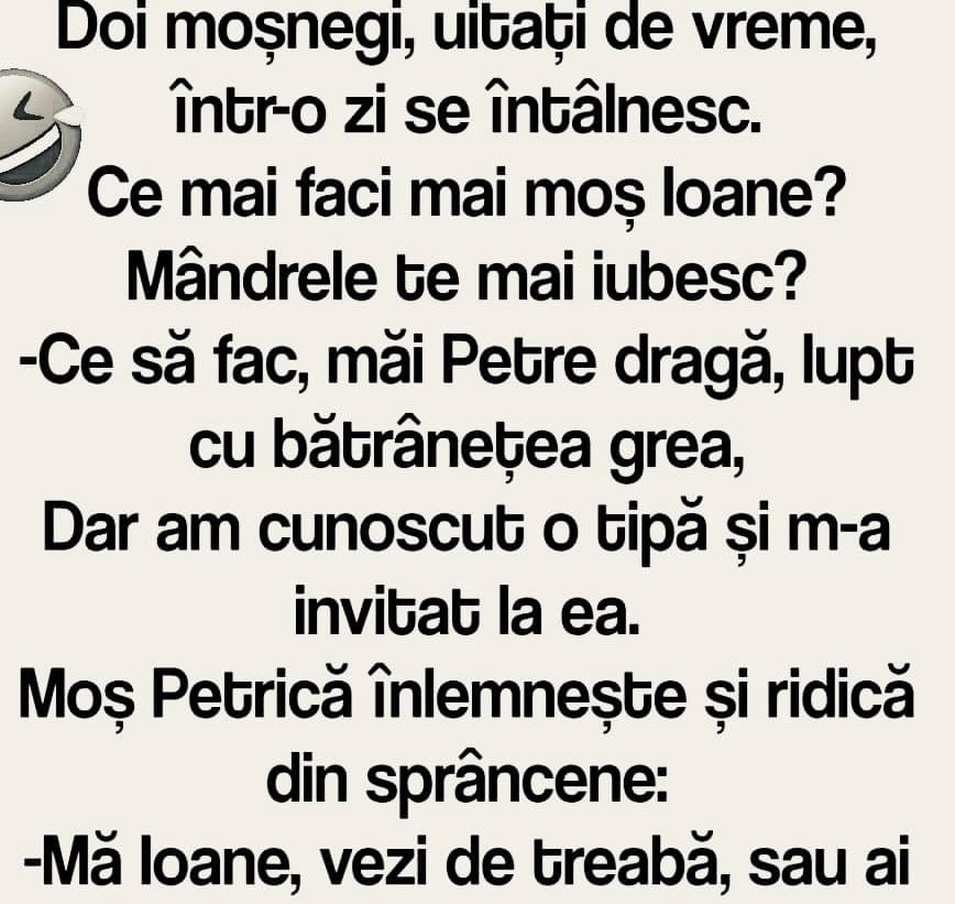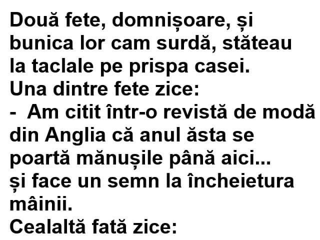 Două fete, domnișoare, și bunica lor cam surdă, stăteau la taclale pe prispa casei.Una dintre fete zice: – Am citit într-o revistă de modă din Anglia că anul ăsta se poartă mănușile până aici… și face un semn la încheietura mâinii.Cealaltă fată zice: – Eu am citit într-o revistă de modă din Franta că anul … Read more
