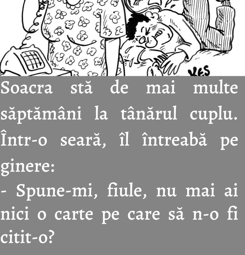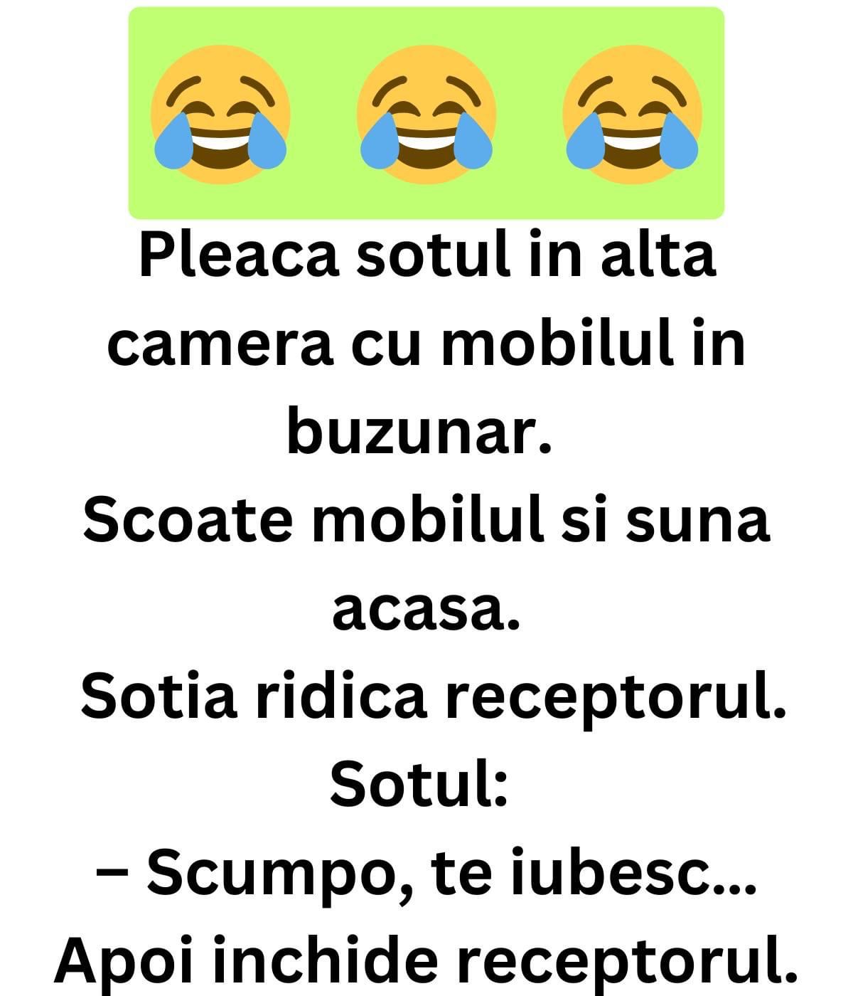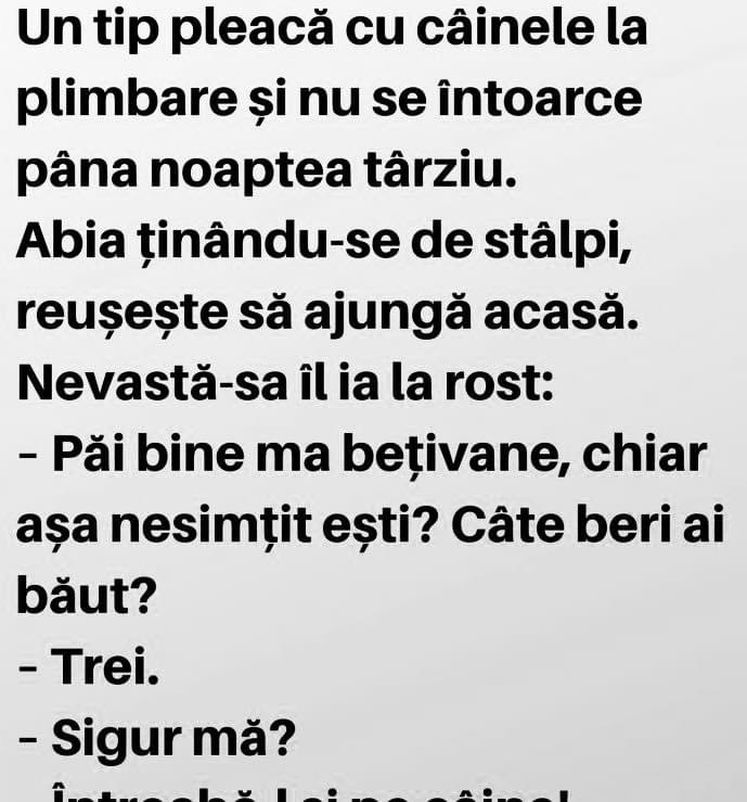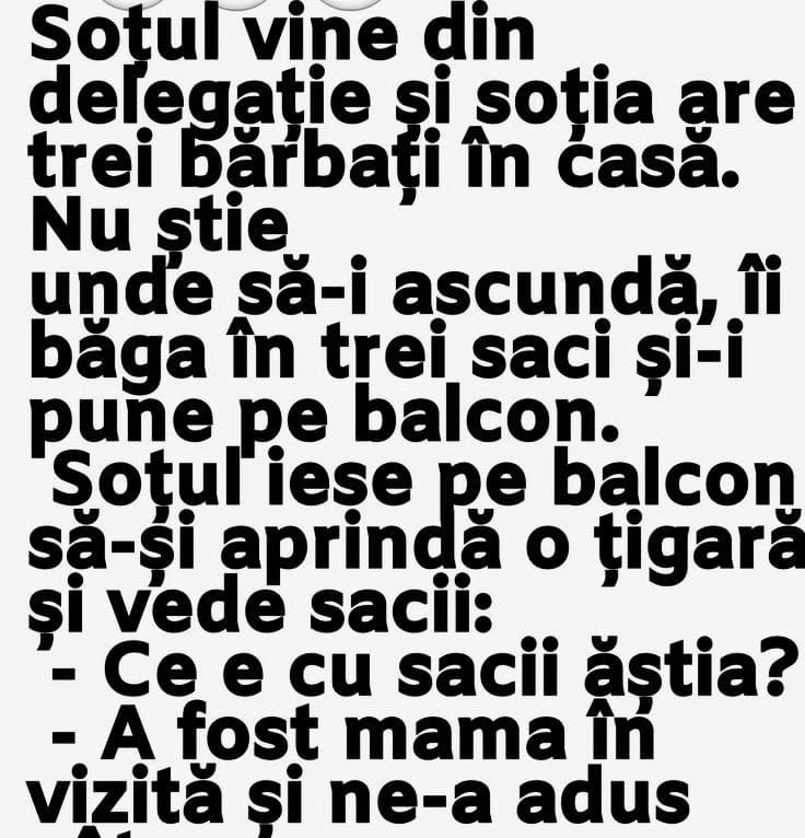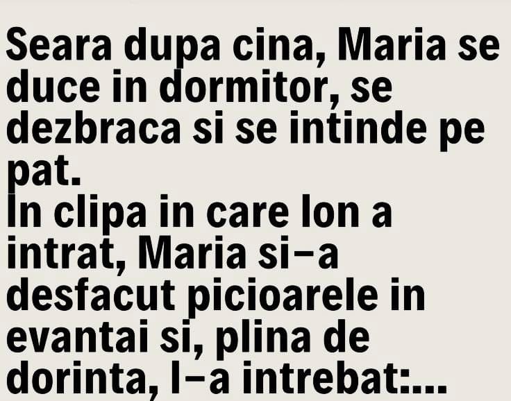 Seara dupa cina, Maria se duce in dormitor, se dezbraca si se intinde pe pat.In clipa in care Ion a intrat, Maria si-a desfacut … si, plina de dorinta, l-a intrebat:– Ioane, intelegi ce vreau?– Da, inteleg, vrei sa ocupi tu tot patul. Citiți și: O grămadă de pescari, cu undite de mii de dolari, … Read more