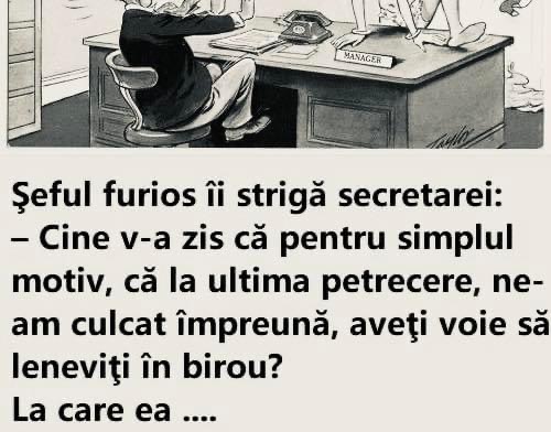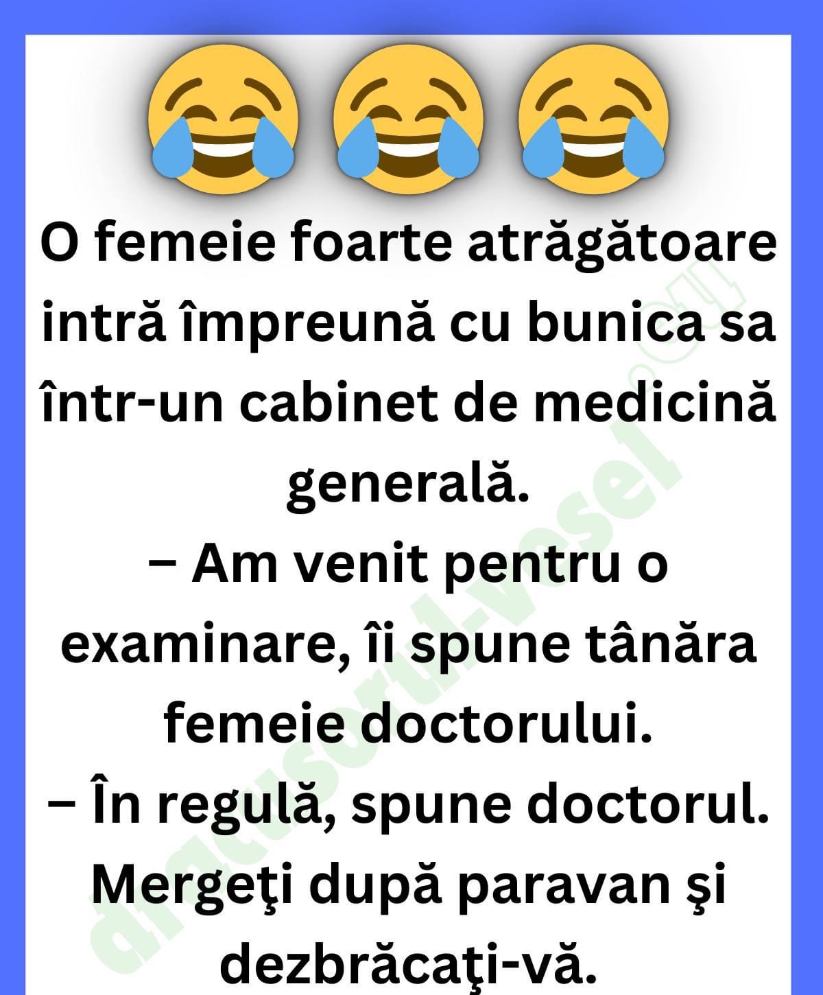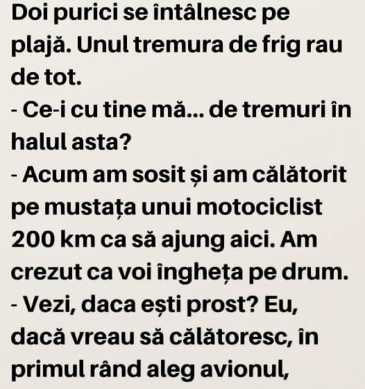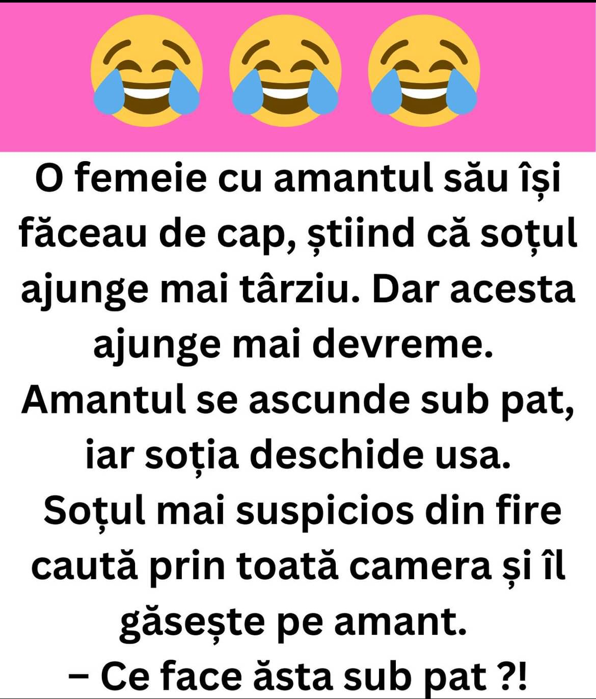 Seara dupa cina, Maria se duce in dormitor, se dezbraca si se intinde pe pat.In clipa in care Ion a intrat, Maria si-a desfacut … si, plina de dorinta, l-a intrebat:– Ioane, intelegi ce vreau?– Da, inteleg, vrei sa ocupi tu tot patul. Citiți și: O grămadă de pescari, cu undite de mii de dolari, … Read more