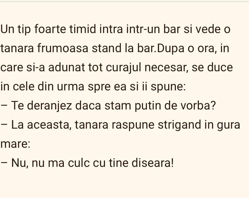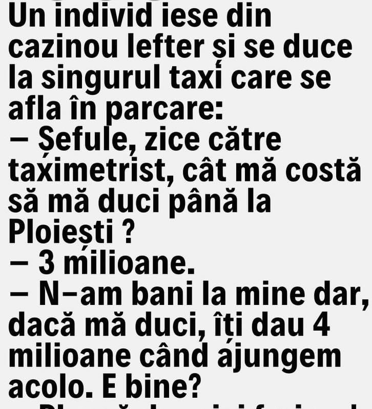 Un ardelean intră într-un bar la New York. Barmanul îi spune că în acest bar se bea numai pe pariu.– Domnule, eu pun pariu cu tine ca nu poți să bei o sticlă de whisky în 30 de minute! Ardeleanul îsi cere scuze, iese din bar și apare peste 10 minute înapoi, pune banu pe … Read more