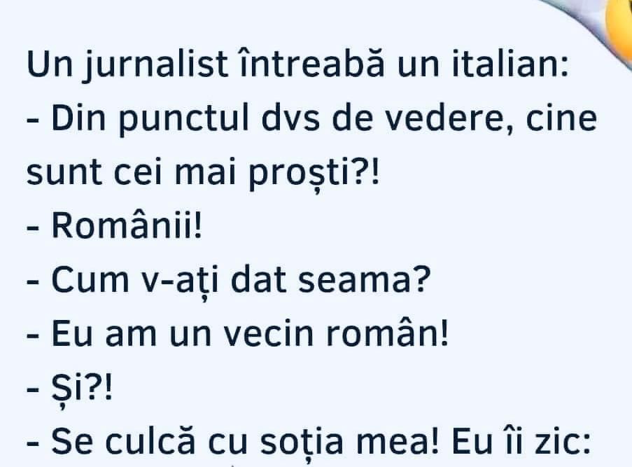 Un jurnalist intreaba un italian: Din punctul dvs de vedere cine sunt cei mai prosti? Romanii! Cum v-ati dat seama? Eu am un vecin roman! Si?!? Se culca cu sotia mea mea!! Eu ii zic: