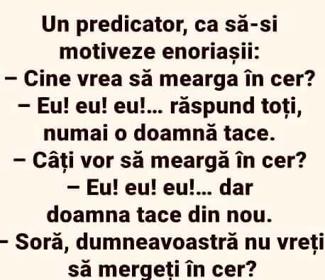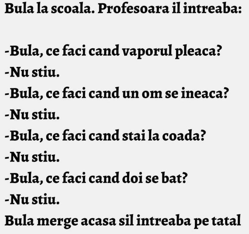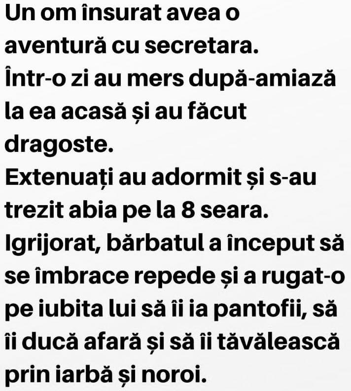 Nevasta și-a ascuns amantul în dulap.Noaptea, amorțit, ăsta îmbracă o blană din dulap și dă să iasă tip-til.Sotul aude, se trezeste si-l vede : – Tu cine mai ești bă ?– O molie!– Și cu blana ce-i, unde-o duci?– O mănânc acasă ! Un mare industriaş are o secretară nouă, blondă. Auzind din biroul său că … Read more