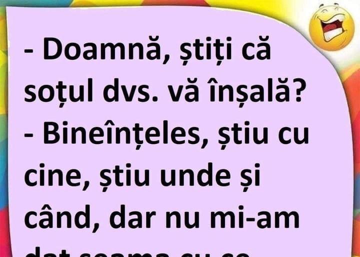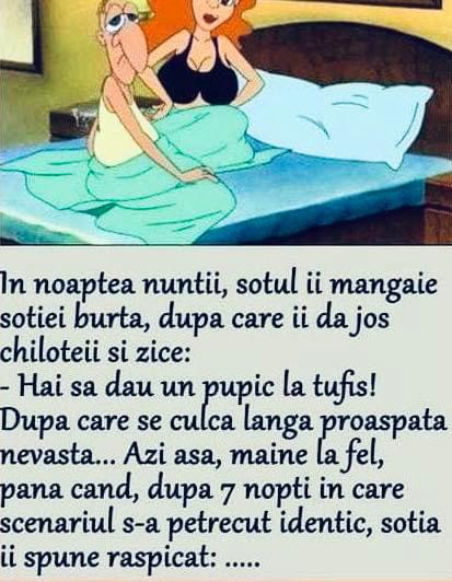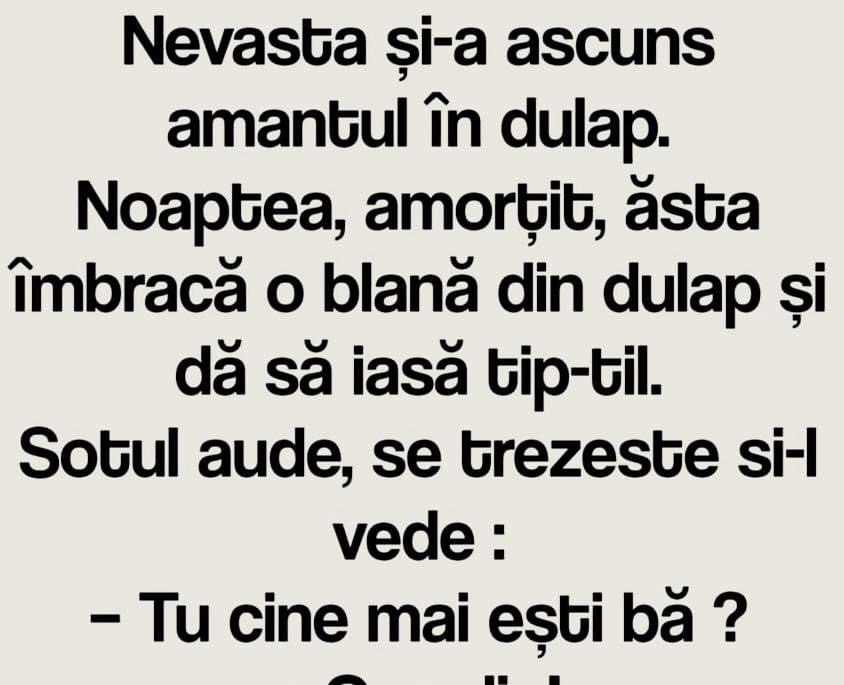 Nevasta și-a ascuns amantul în dulap.Noaptea, amorțit, ăsta îmbracă o blană din dulap și dă să iasă tip-til.Sotul aude, se trezeste si-l vede :– Tu cine mai ești bă ?
