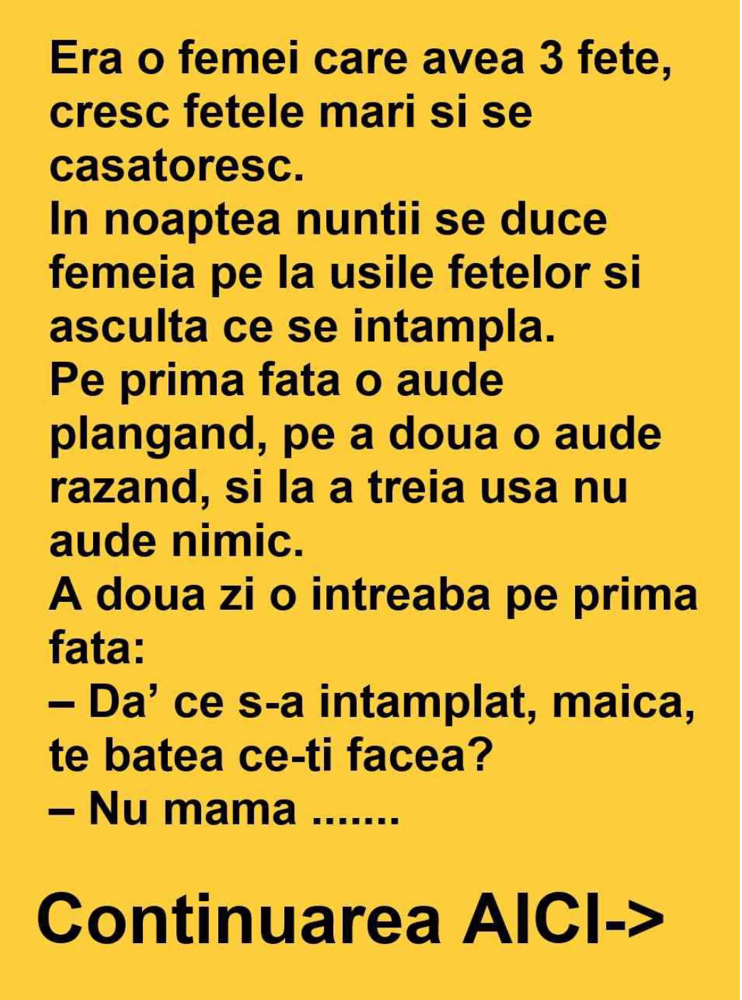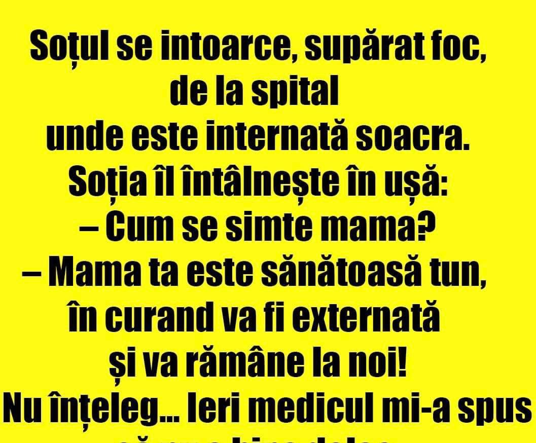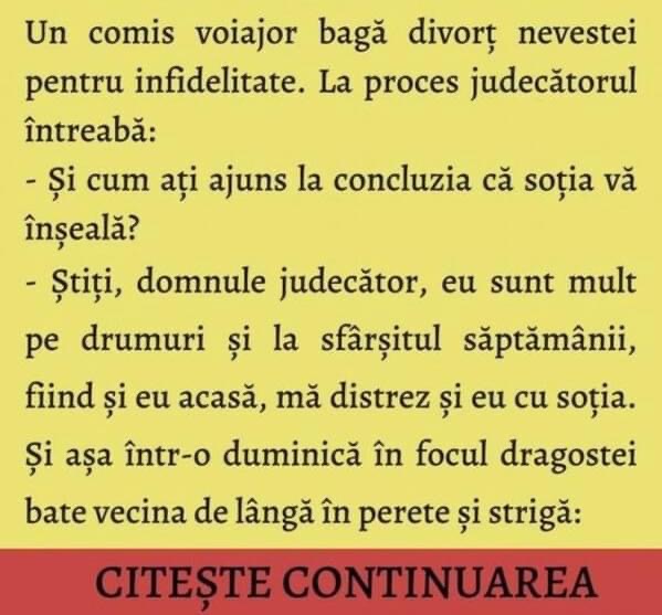 Un comis voiajor bagă divorţ nevestei pentru infidelitate. La proces judecătorul întreabă:– Şi cum aţi ajuns la concluzia că soţia vă înşeală? – Ştiţi, domnule judecător, eu sunt mult pe drumuri şi la sfârşitul săptămânii, fiind şi eu acasă, mă distrez şi eu cu soţia. ŞI aşa într-o duminică în focul dragostei bate vecina de … Read more