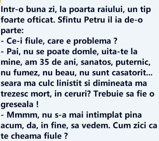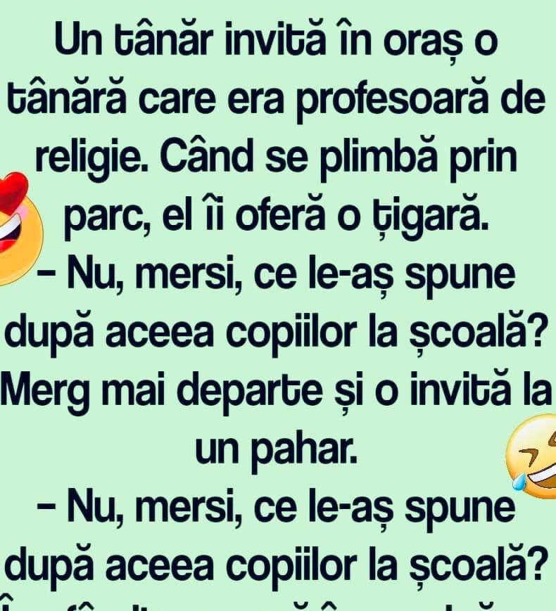 Un tânăr invită în oraş o tânără care era profesoară de religie. Când se plimbă prin parc, el îi oferă o ţigară. – Nu, mersi, ce le-aş spune după aceea copiilor la şcoală?Merg mai departe şi o invită la un pahar.– Nu, mersi, ce le-aş spune după aceea copiilor la şcoală?În sfârşit, se urcă în … Read more