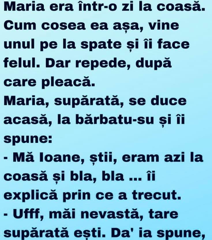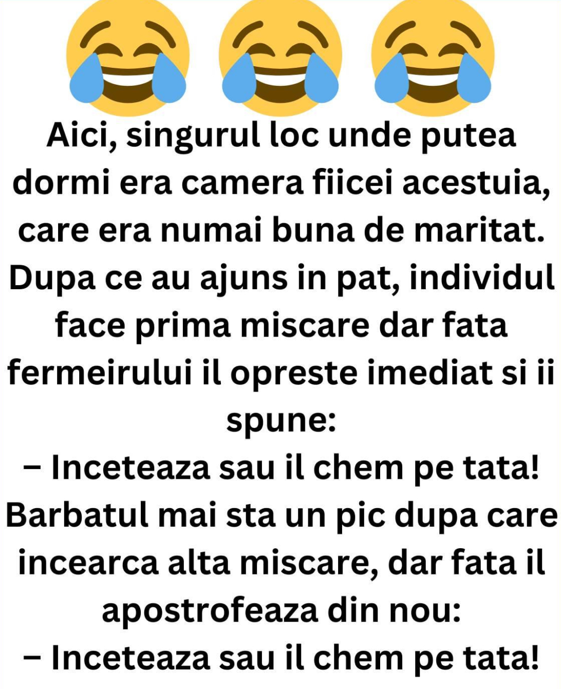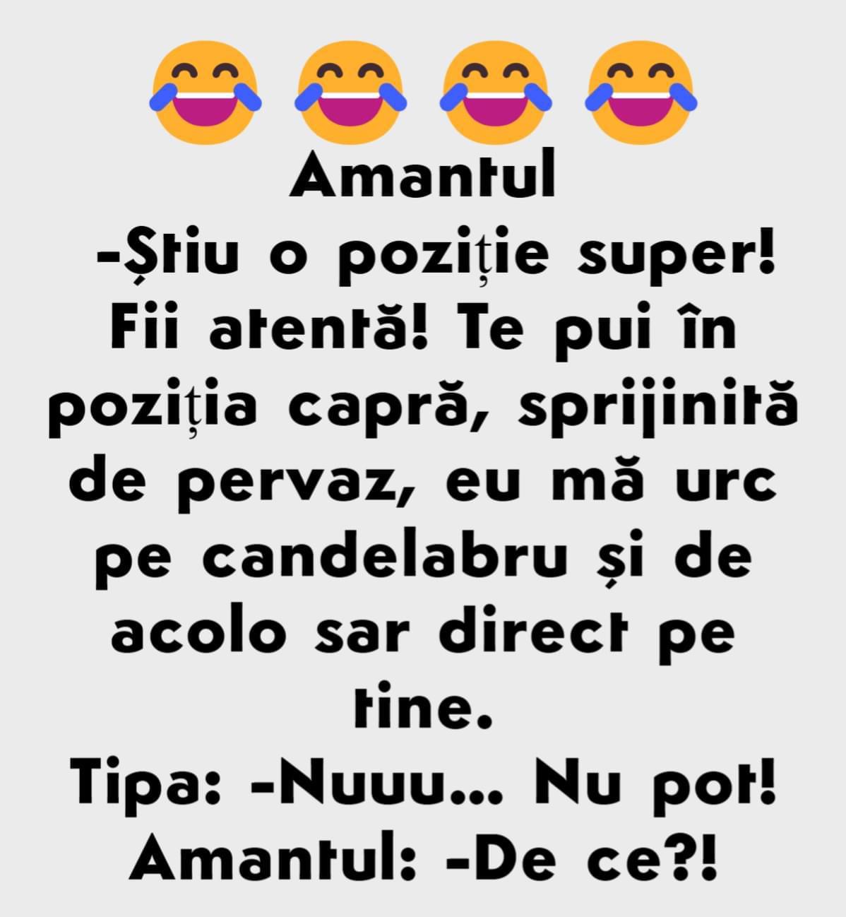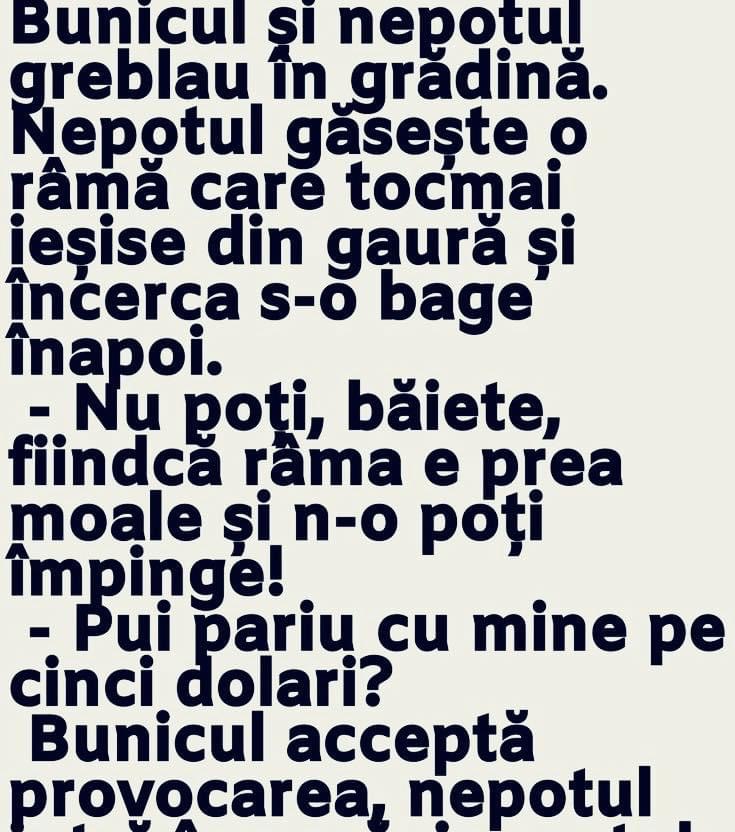 Trei purici s-au adunat, la sfat, in buricul unei femei.S-au hotarat ca fiecare sa-si aleaga o parte a corpului, unde sa petreaca noaptea, iar, a doua zi, sa se reuneasca in buric si sa spuna cum au dormit.Primul puric s-a ascuns sub brat, al doilea intre sani iar al treilea in p*z***A doua zi, se … Read more