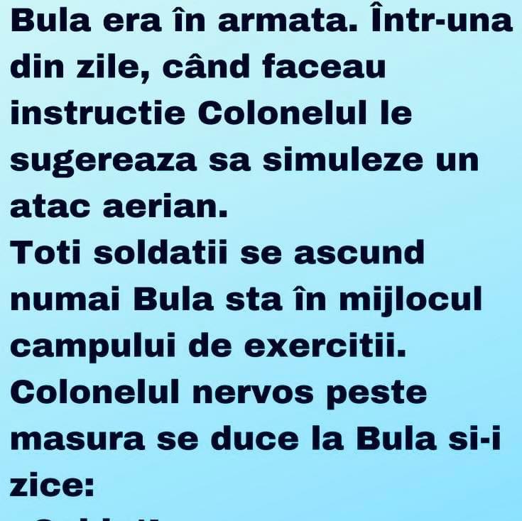 Bula era în armata. Într-una din zile, când faceau instructie Colonelul le sugereaza sa simuleze un atac aerian. Toti soldatii se ascund numai Bula sta în mijlocul campului de exercitii. Colonelul nervos peste masura se duce la Bula si-i zice: Soldat! – Da,sa traiti! – De ce nu stai ascuns cum fac ceilalti, ba cretinule!!! … Read more