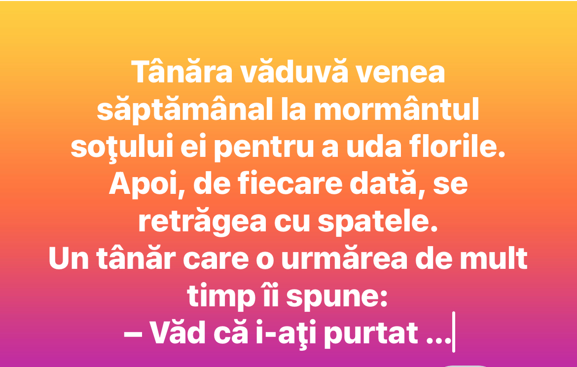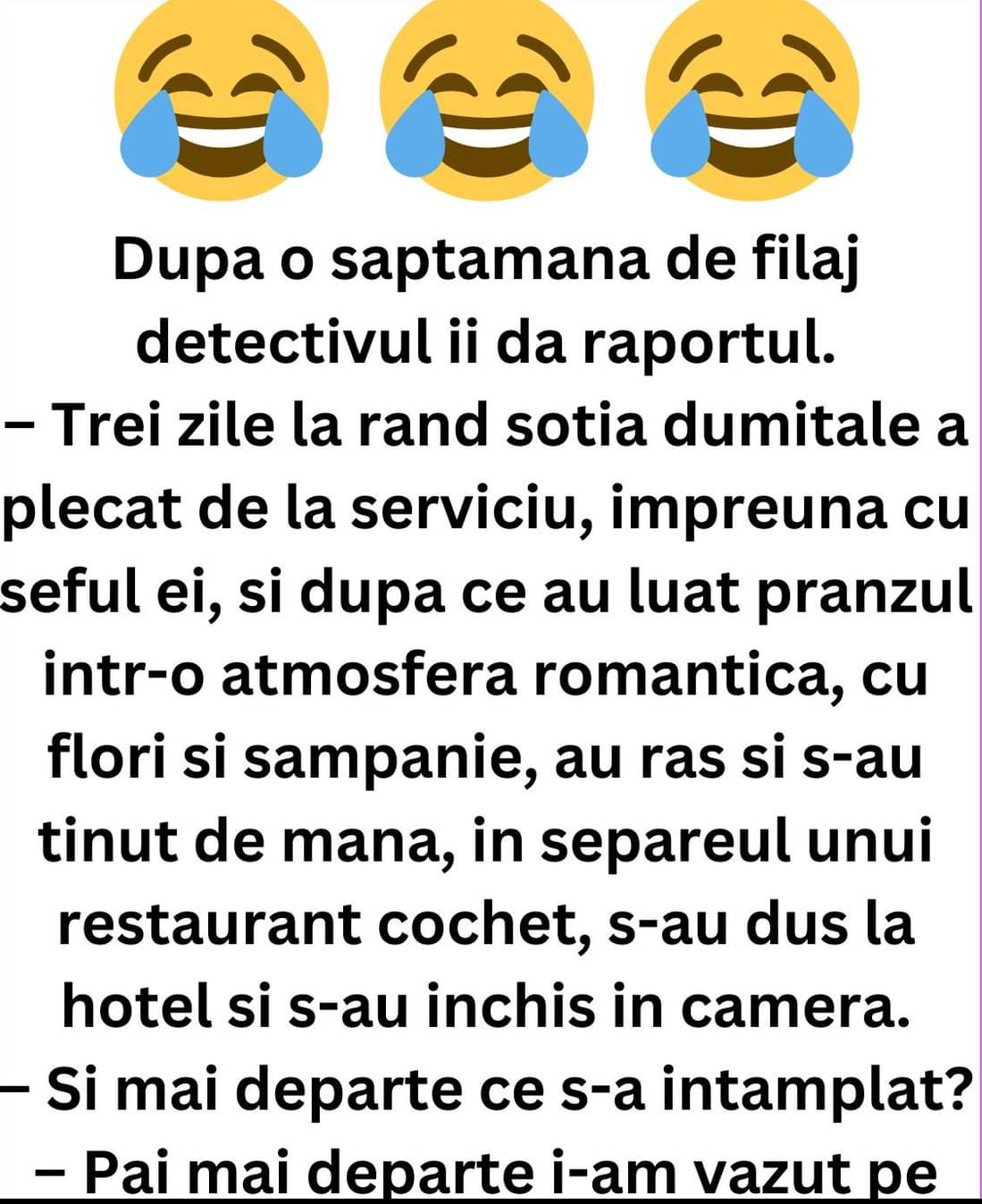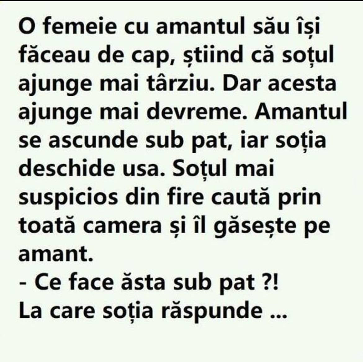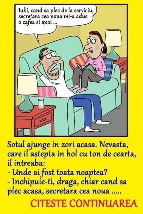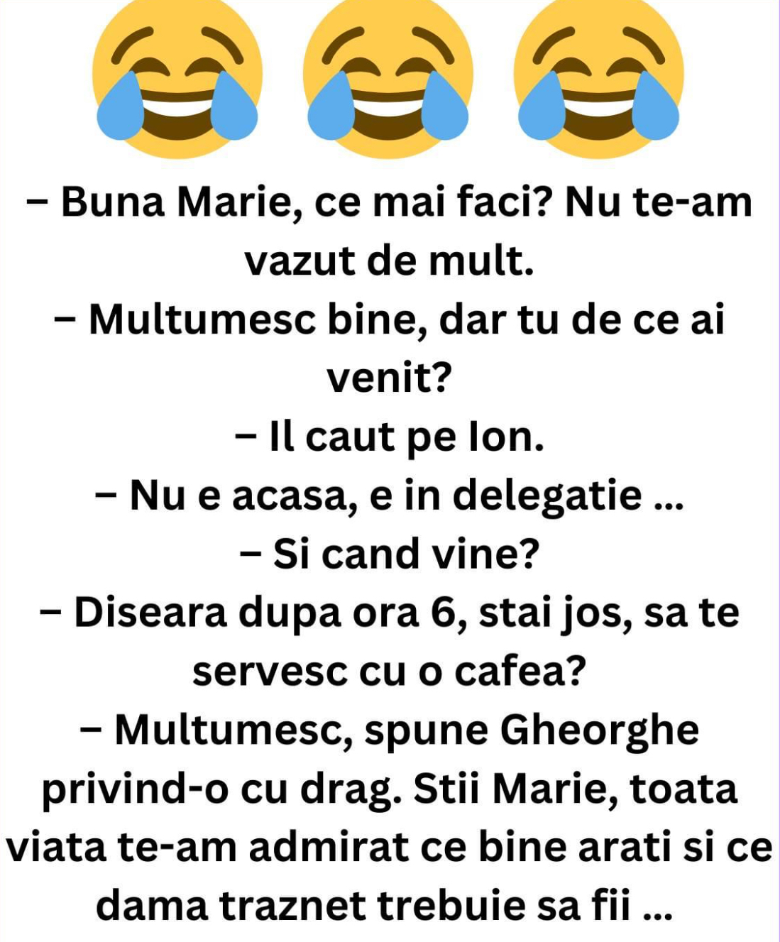 Gheorghe vine acasa la Ion si o intalneste in bucatarie pe Maria. Buna Marie, ce mai faci? Nu te-am vazut de mult.– Multumesc bine, dar tu de ce ai venit?– Il caut pe Ion.– Nu e acasa, e in delegatie … – Si cand vine?– Diseara dupa ora 6, stai jos, sa te servesc cu … Read more