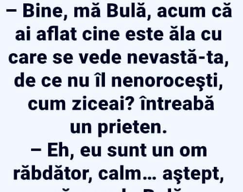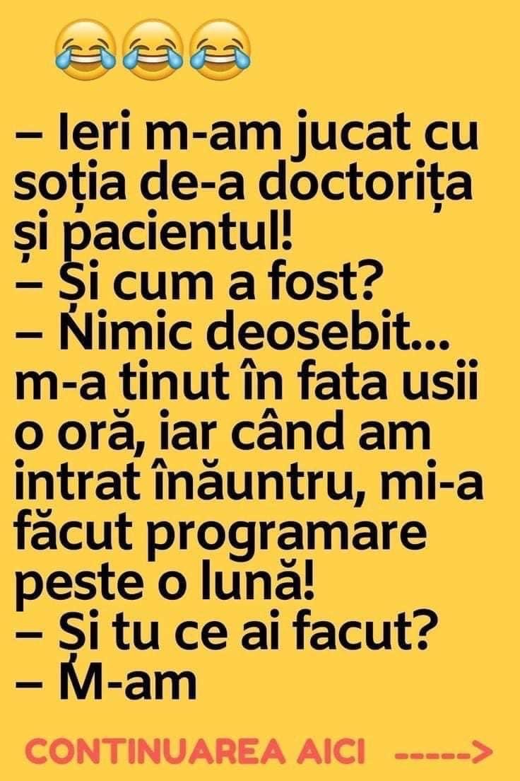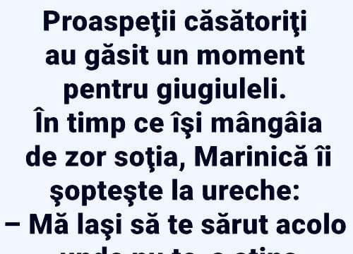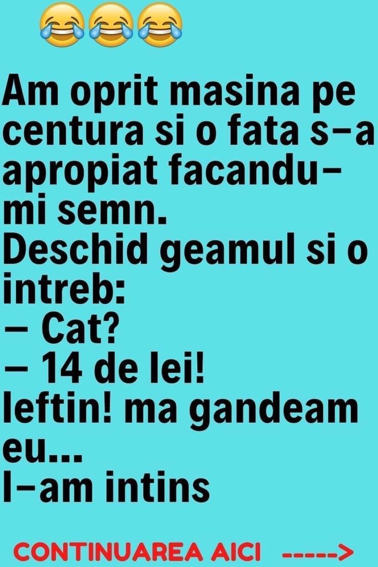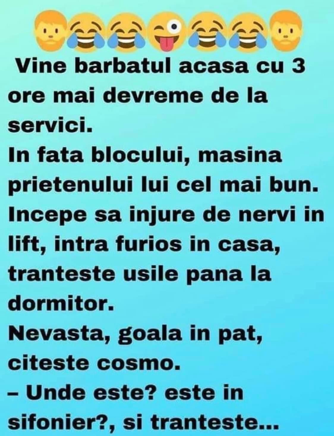 Sotul si-a uitat telefonul acasa. cand s-a intors de la serviciu, a gasit doua mesaje:1. De la amanta: Dragul meu, iubitul meu, mi-e dor. Pup dulce. Suna-ma. A ta Marie.2. De la sotie: Nu-ti face griji. Am sunat-o eu! Bulă, sună-l pe taică-tu şi vezi când ajunge acasă!– Am sunat, mamă, dar răspunde o femeie … Read more