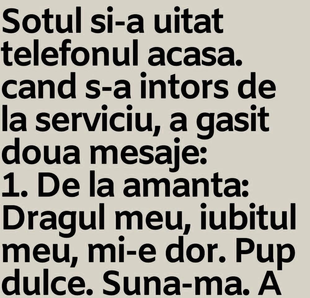 Sotul si-a uitat telefonul acasa. cand s-a intors de la serviciu, a gasit doua mesaje:De la amanta: Dragul meu, iubitul meu, mi-e dor. Pup dulce. Suna-ma. A ta Marie.