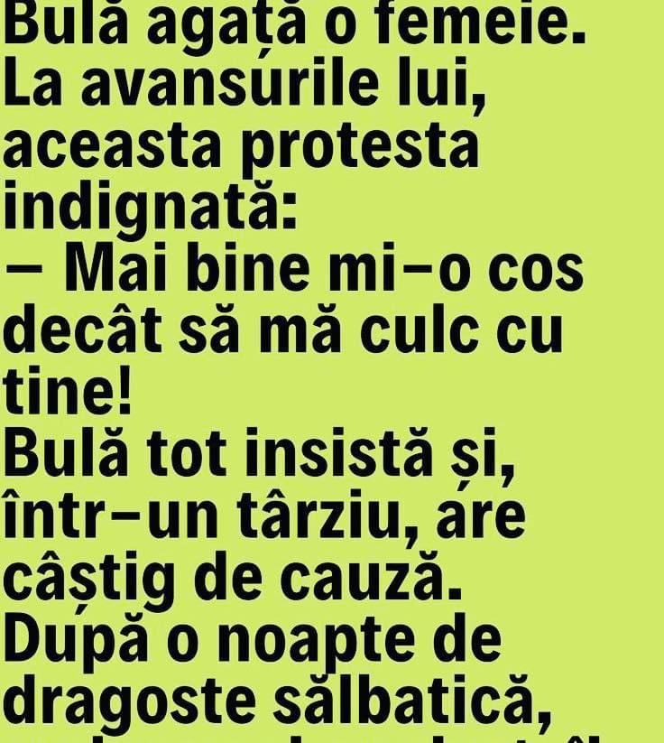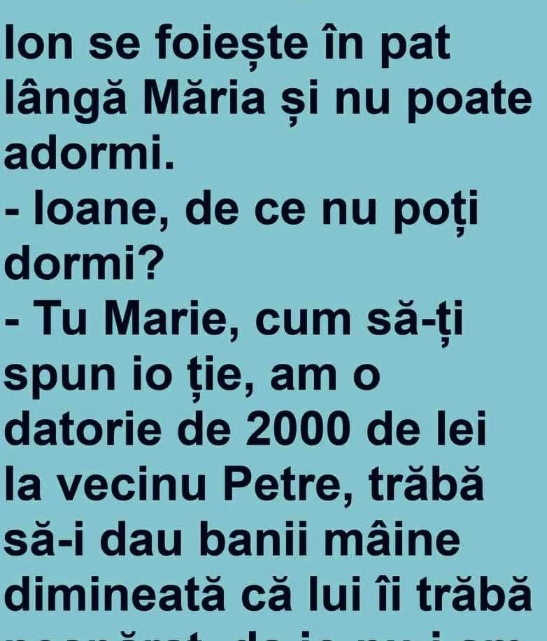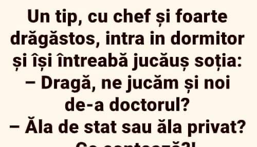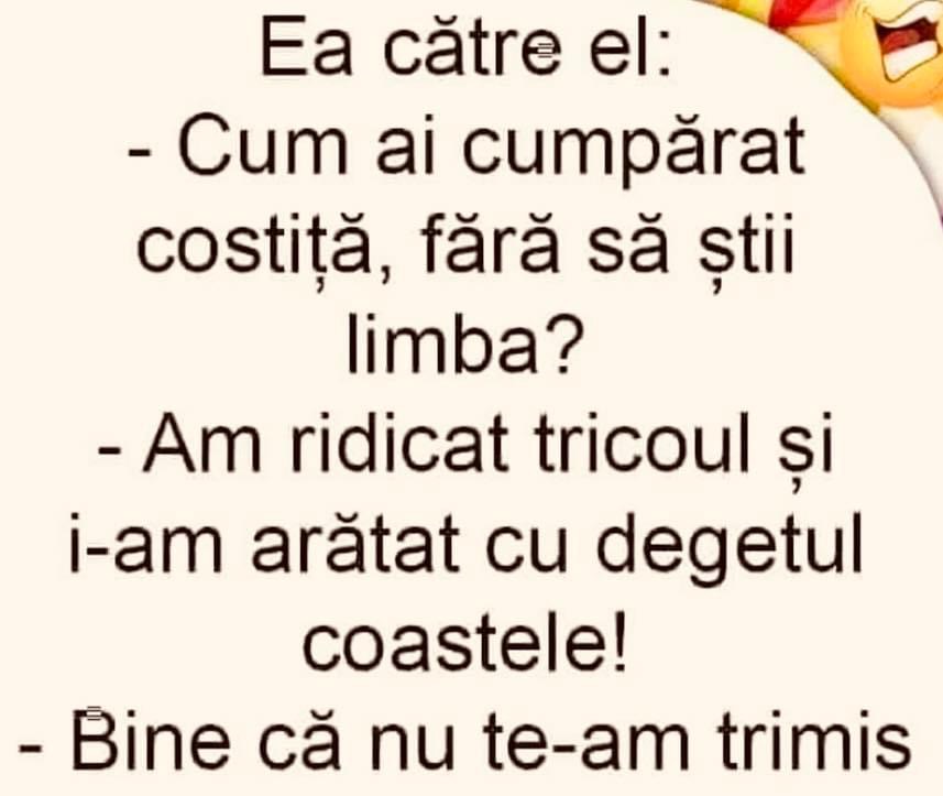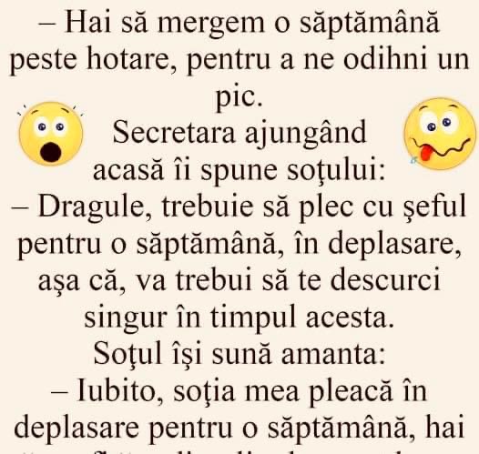 Hai să mergem o săptămână peste hotare, pentru a ne odihni un pic.Secretara ajungând acasă îi spune soţului: – Dragule, trebuie să plec cu şeful pentru o săptămână, în deplasare, aşa că, va trebui să te descurci singur în timpul acesta. Soţul îşi sună amanta: – Iubito, soţia mea pleacă în deplasare pentru o săptămână, … Read more