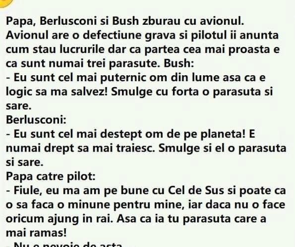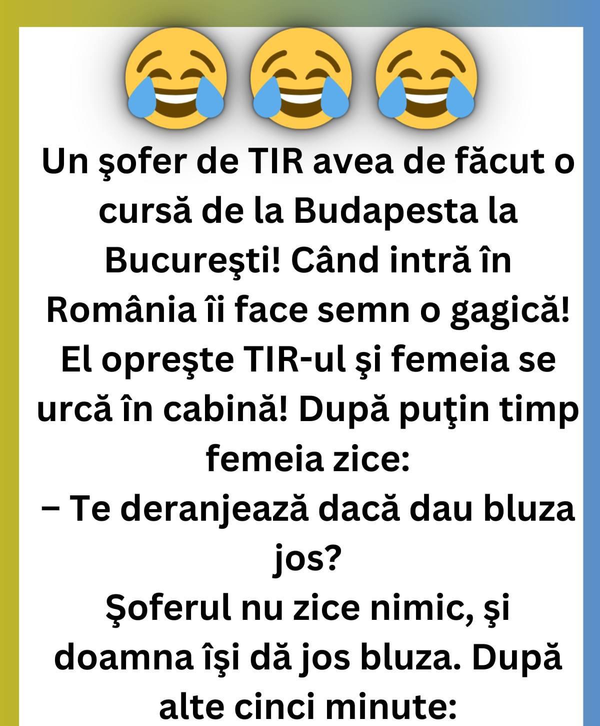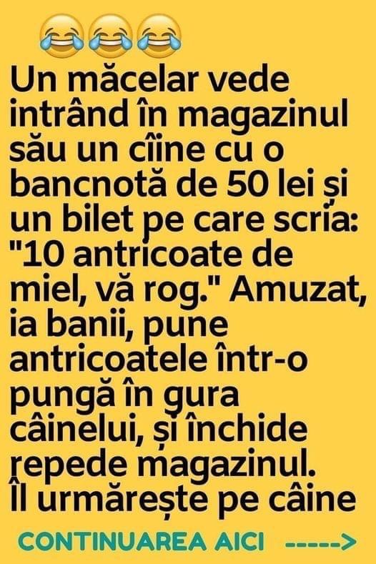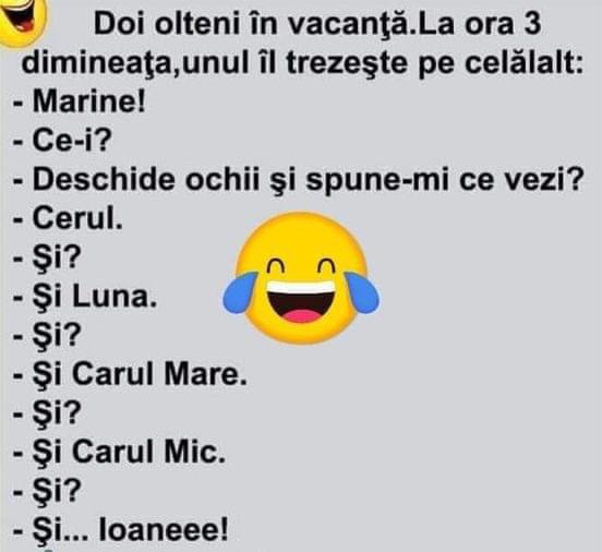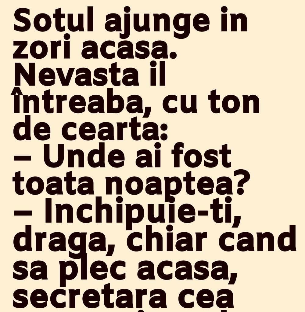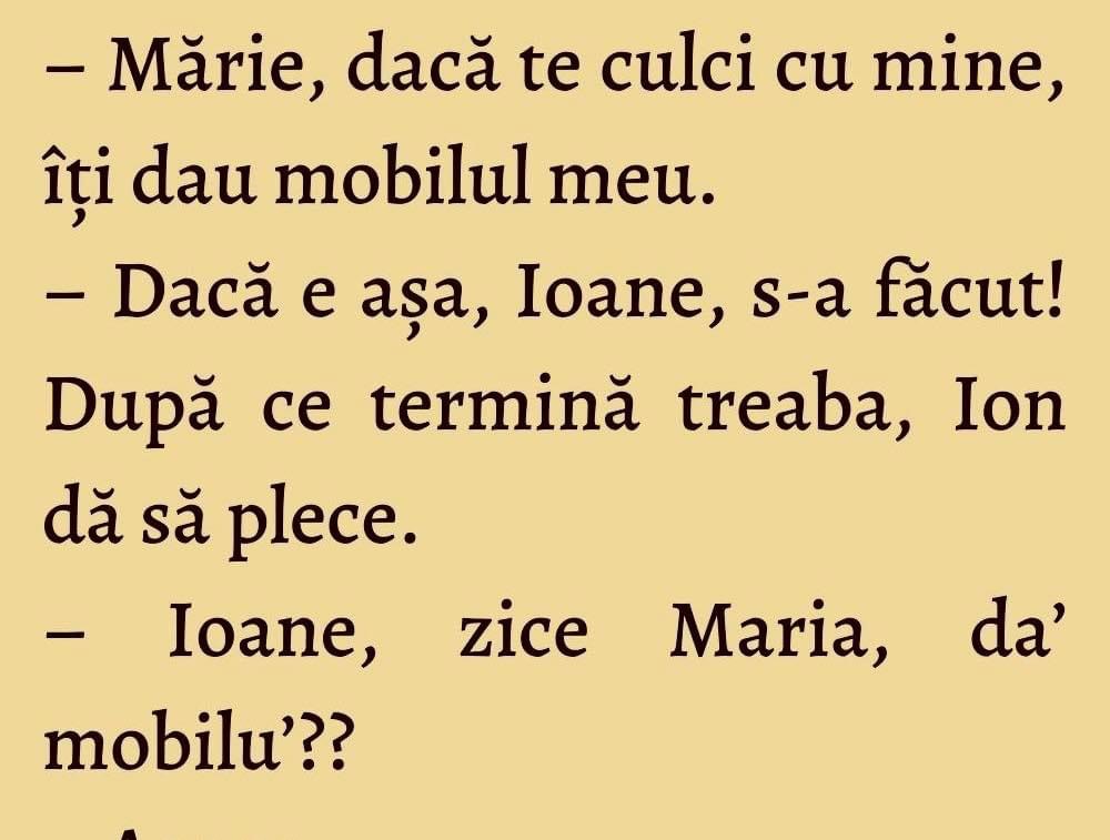 Ion si Vasile discuta la birt:– Bai, Ioane iti plac femeile grase?– Nu!– Auzi, iti plac femeile cu fundul mare?– Nu!– Iti plac femeile cu celulita si neepilate?– Nu!– Atunci de ce te culci cu nevasta-mea? Nevasta-mea mi-a gasit telefonul si a inceput sa-mi citeasca mesajele: Cine dracu’ e Alina?!? zbiera ea. Si de ce … Read more