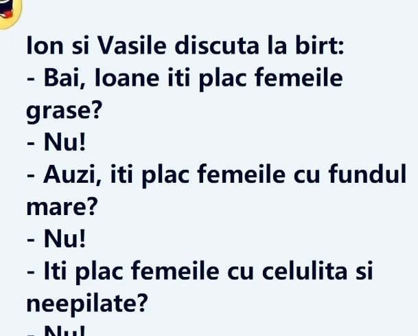 Ion si Vasile discuta la birt:– Bai, Ioane iti plac femeile grase?– Nu!– Auzi, iti plac femeile cu fundul mare?