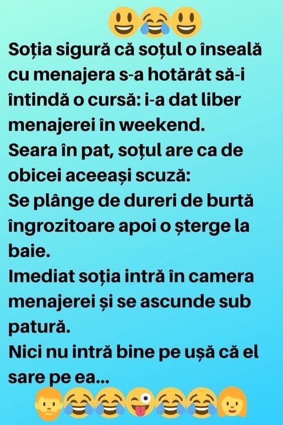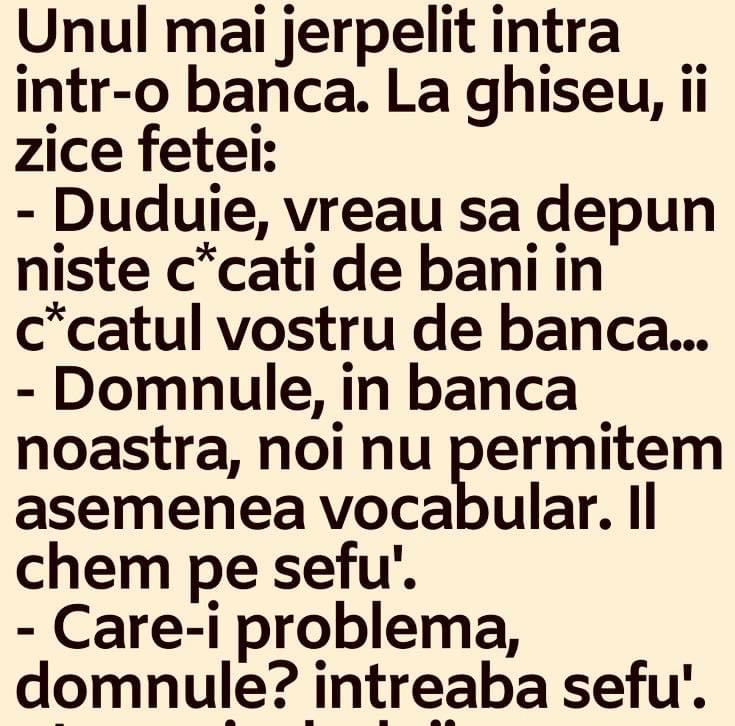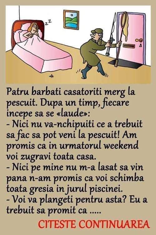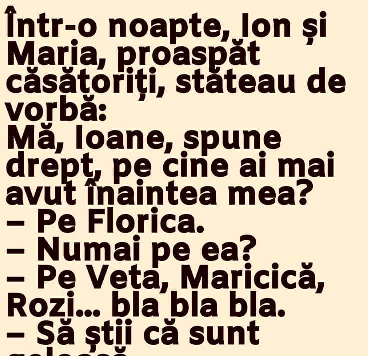 Vine o fata la mine aseara in club si ma intreaba:– Crezi ca sunt grasa?– Grasa?…Iubito, esti ca o sfoara! ii spun.– Adevarat? imi raspunse, zambind. Crezi ca sunt subtire?– O Dumnezeule, nu! i-am raspuns. Ma refeream la faptul ca probabil esti mult mai usor de tras, decat de impins. – Vai, domnişoară, zice admirativ … Read more