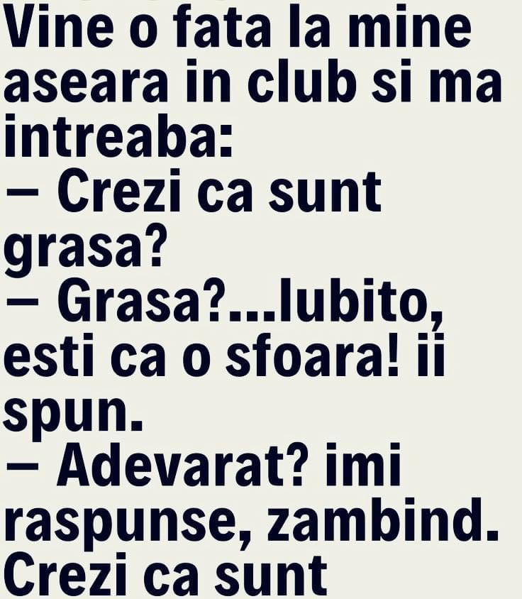 Vine o fata la mine aseara in club si ma intreaba:– Crezi ca sunt grasa?– Grasa?…Iubito, esti ca o sfoara! ii spun.– Adevarat? imi raspunse..