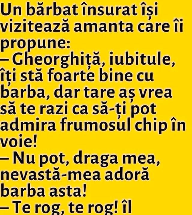 Un bărbat însurat îşi vizitează amanta care îi propune:– Gheorghiţă, iubitule, îţi stă foarte bine cu barba, dar tare aş vrea să te razi