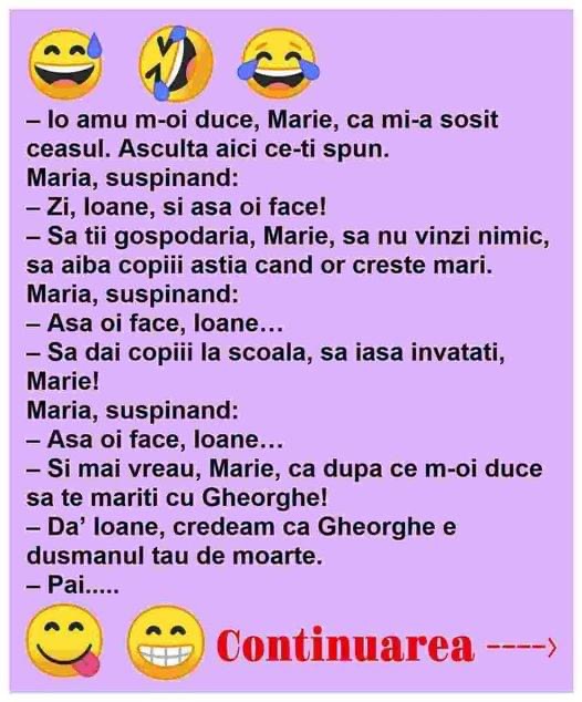 – Si mai vreau, Marie, ca dupa ce m-oi duce sa te mariti cu Gheorghe!