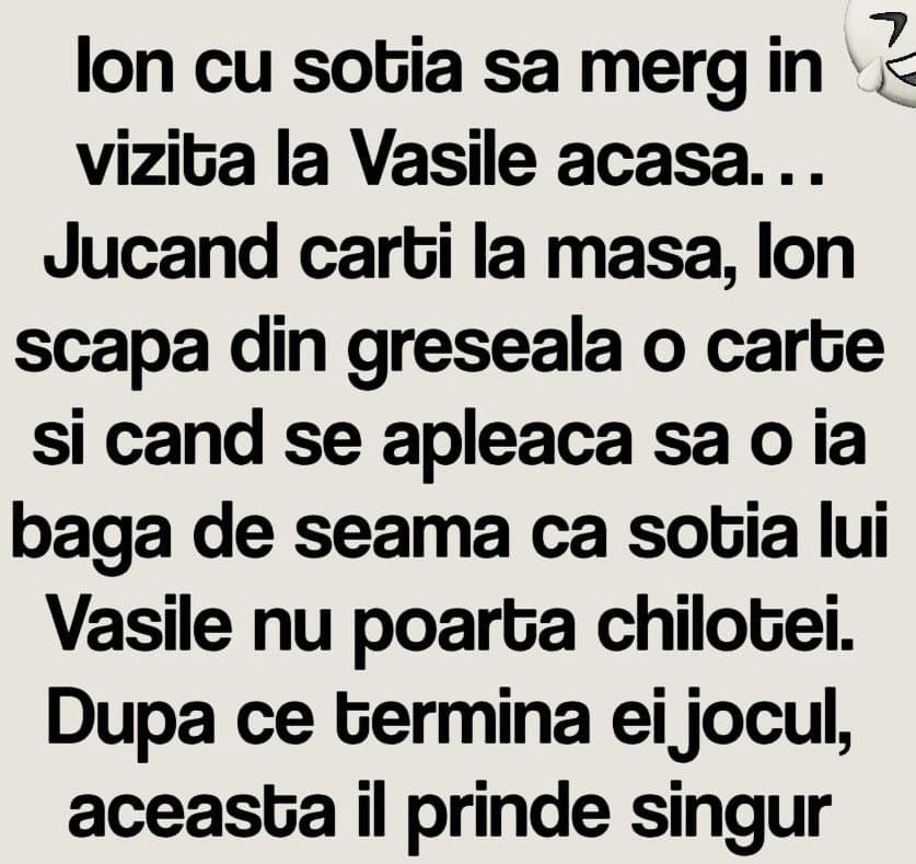 Ion cu sotia sa merg in vizita la Vasile acasa… Jucand carti la masa, Ion scapa din greseala o carte si cand se apleaca sa o ia baga de seama ca sotia lui Vasile nu poarta nimic.