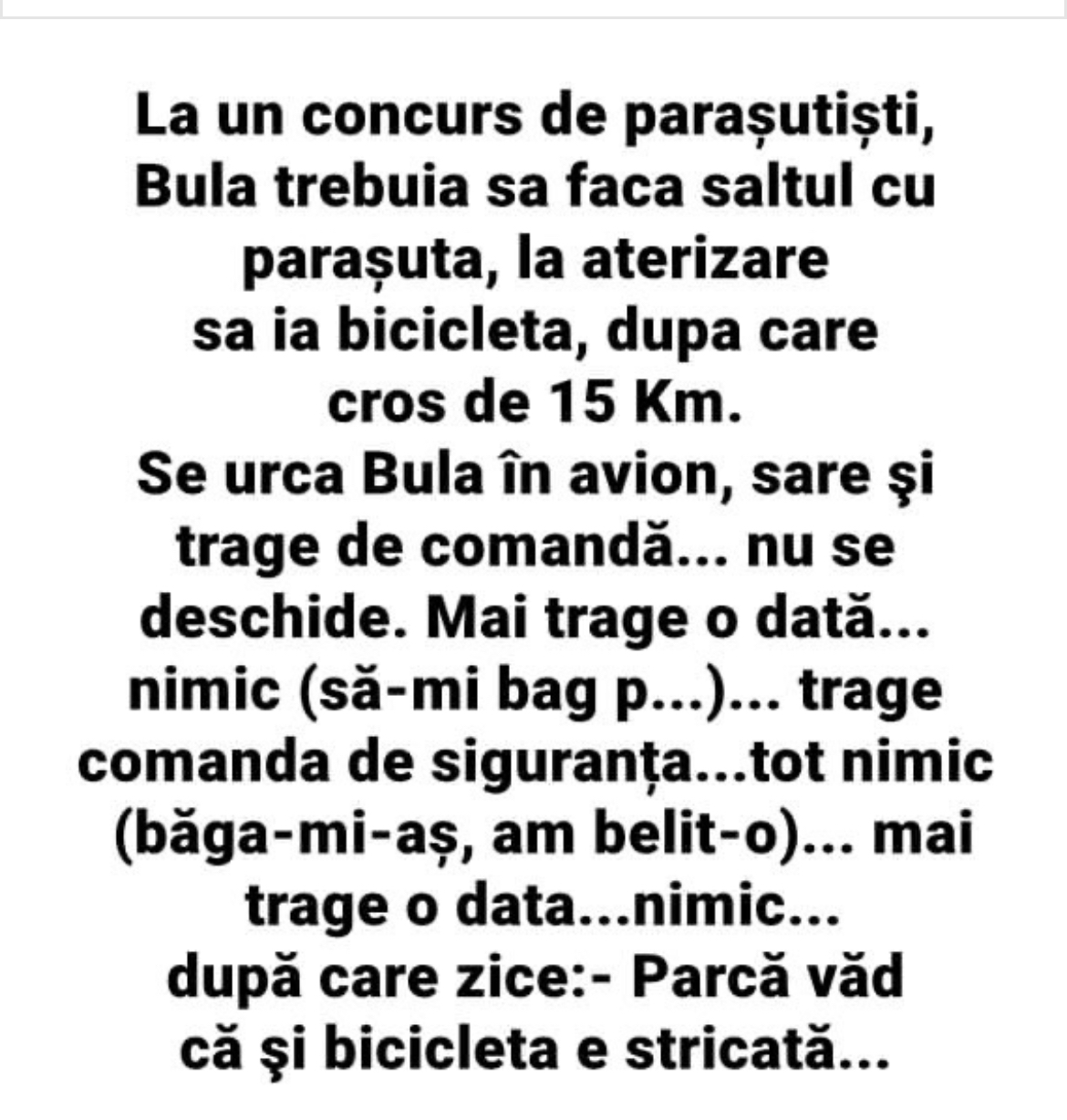 La un concurs de parasutisti Bula trebuia sa faca saltul cu parasuta la aterizare sa ia bicicleta dupa care cros 15 km…Se urca in avion..