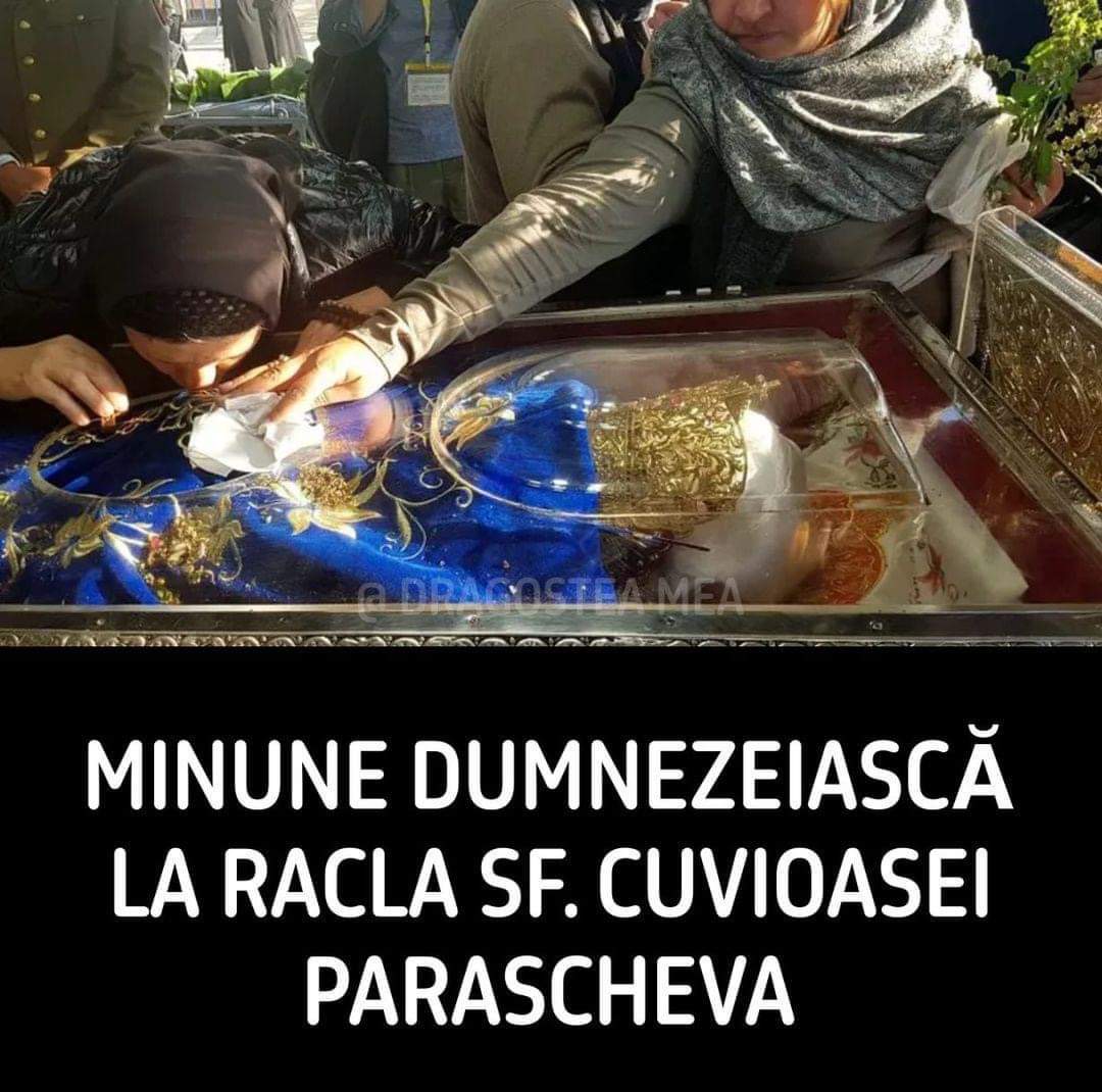 Minune la racla Sfintei Cuvioase Parascheva. Pe 14 octombrie, de hramul Sfintei Cuvioase, valuri de pelerini vin să se închine la moaştele binecuvântate ale Sfintei. Dar sărbătoarea Cuvioasei Parascheva nu este singura zi în care oamenii vin la Catedrala Mitropolitană de la Iaşi, unde odihnesc rămăşiţele Preacuvioasei. Aceştia vin zilnic pentru a-i cere ajutorul, care li se arată negreşit şi, de multe ori, în foarte scurt timp.