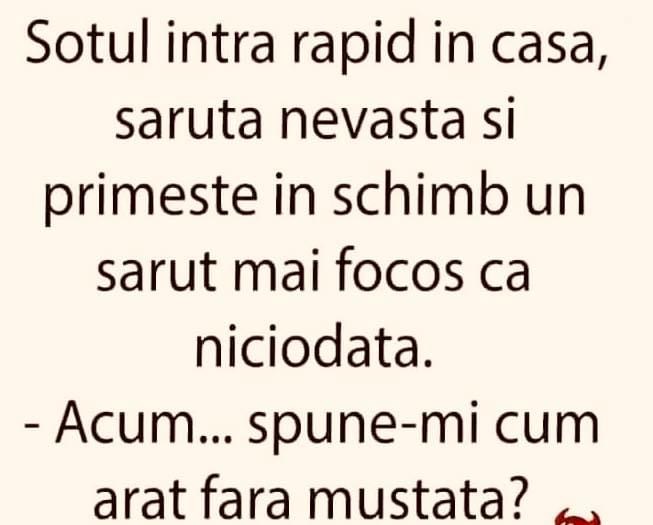 Sotul intra rapid in casa saruta nevasta si primeste in schimb ..Acum spune-mi cum ..