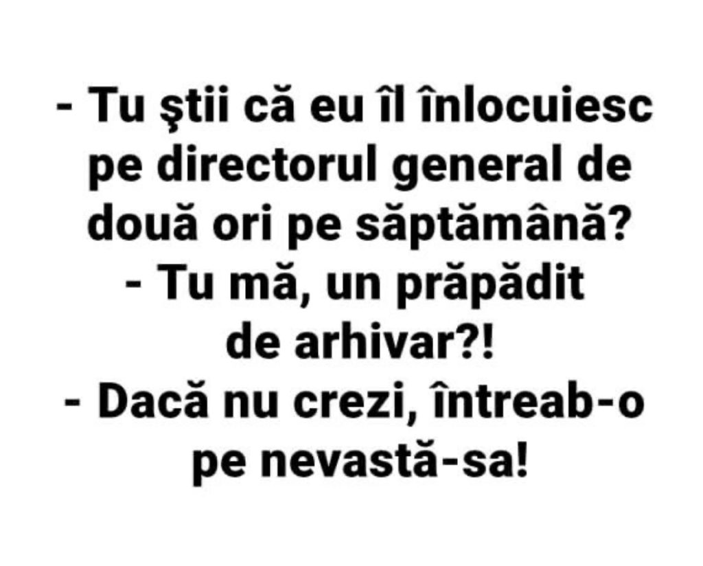 - O scutur ca să mai crească, zice domnul Popescu. După câteva zile, într-o seară, cei doi se certă. Dimineaţa, intră amâandoi în baie, ea la oglindă, el la WC. El termină de făcut pipi, trage repede pantalonii şi dă să iasă. Ea se întoarce scandalizată şi-i zice: