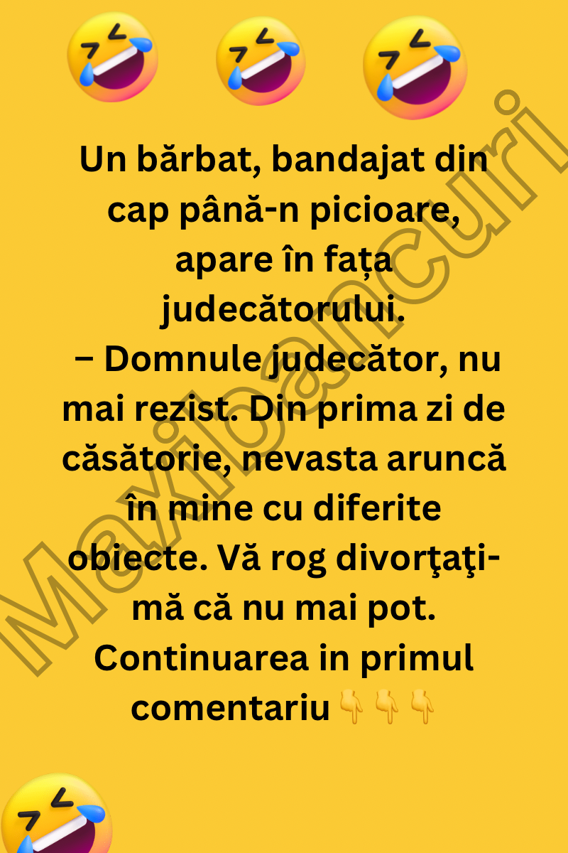 – Domnule judecător, începe bărbatul cu o voce stinsă, nu mai rezist! Din prima zi de căsătorie, nevasta mea aruncă în mine cu tot ce îi pică în mână. Farfurii, cărți, vase, chiar și scaune! Vă rog, divorțați-mă, că nu mai pot.