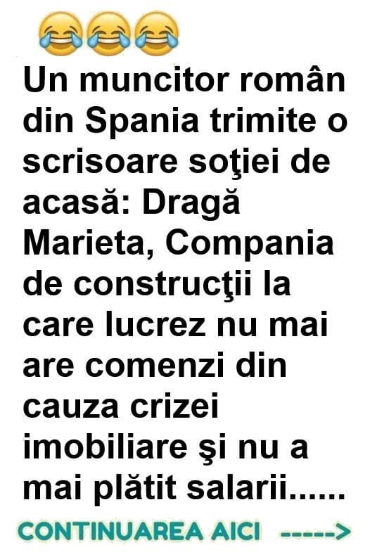 Draga Marieta, Compania de constructii la care lucrez nu mai are comenzi din cauza crizei imobiliare si nu a mai platit salarii. Asa ca, in loc de salariu, iti trimit luna asta doar 100 de sarutari. Stiu ca ma iubesti si ca ai sa intelegi. Sotul tau iubitor, Vasile.