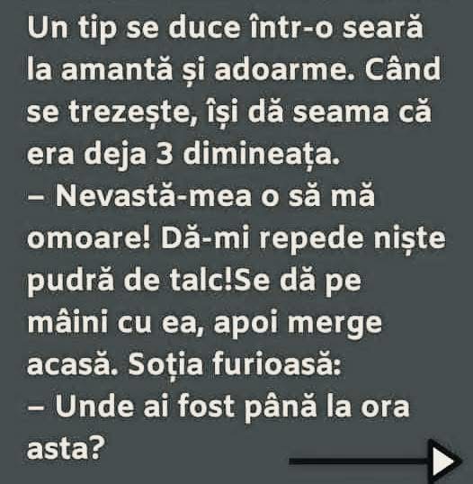 Arată mâinile! Îi zice soţia şi vede că are mâinile pline de pudră de talc.